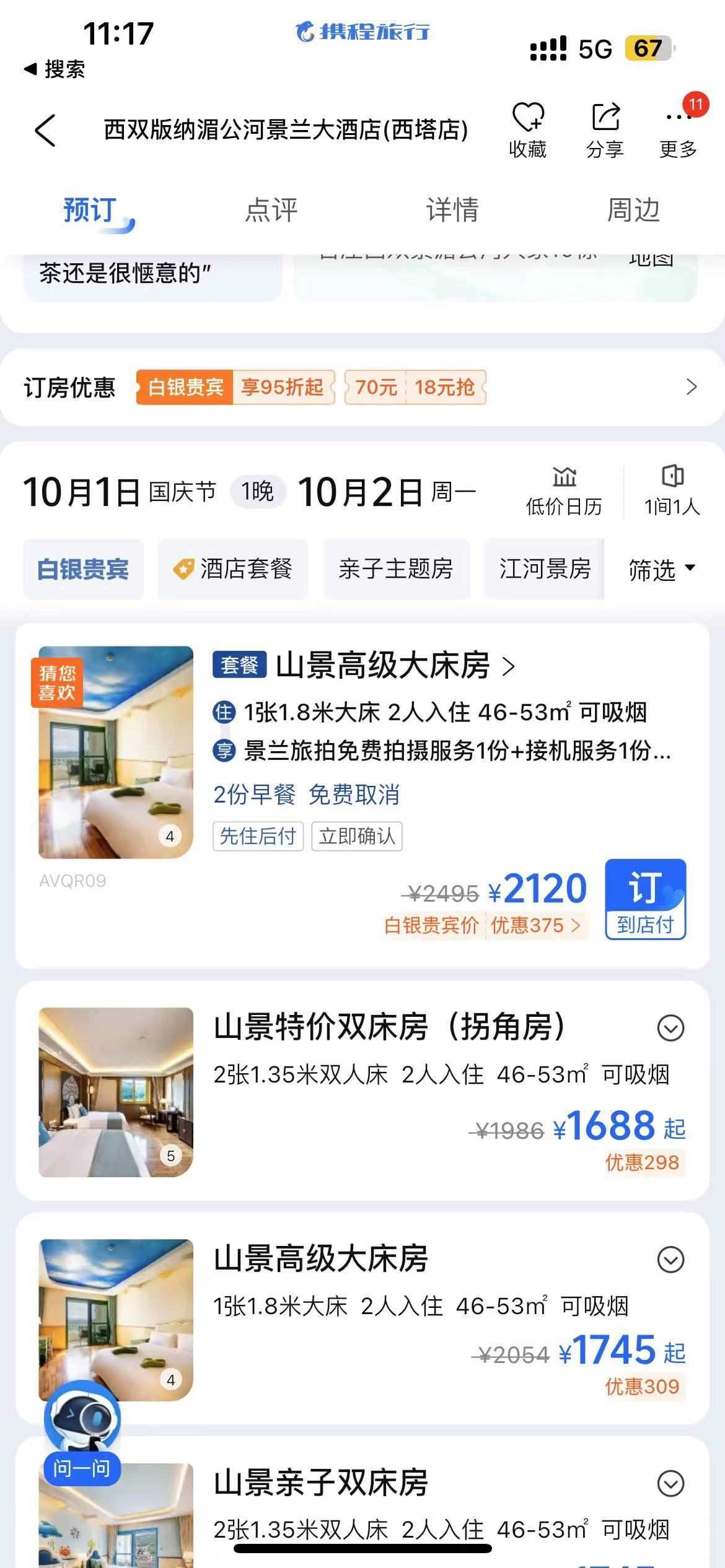 ▲西雙版納湄公河景蘭大酒店的“山景高級大床房”,在10月1日入住、10月2日退房,標價為2120元