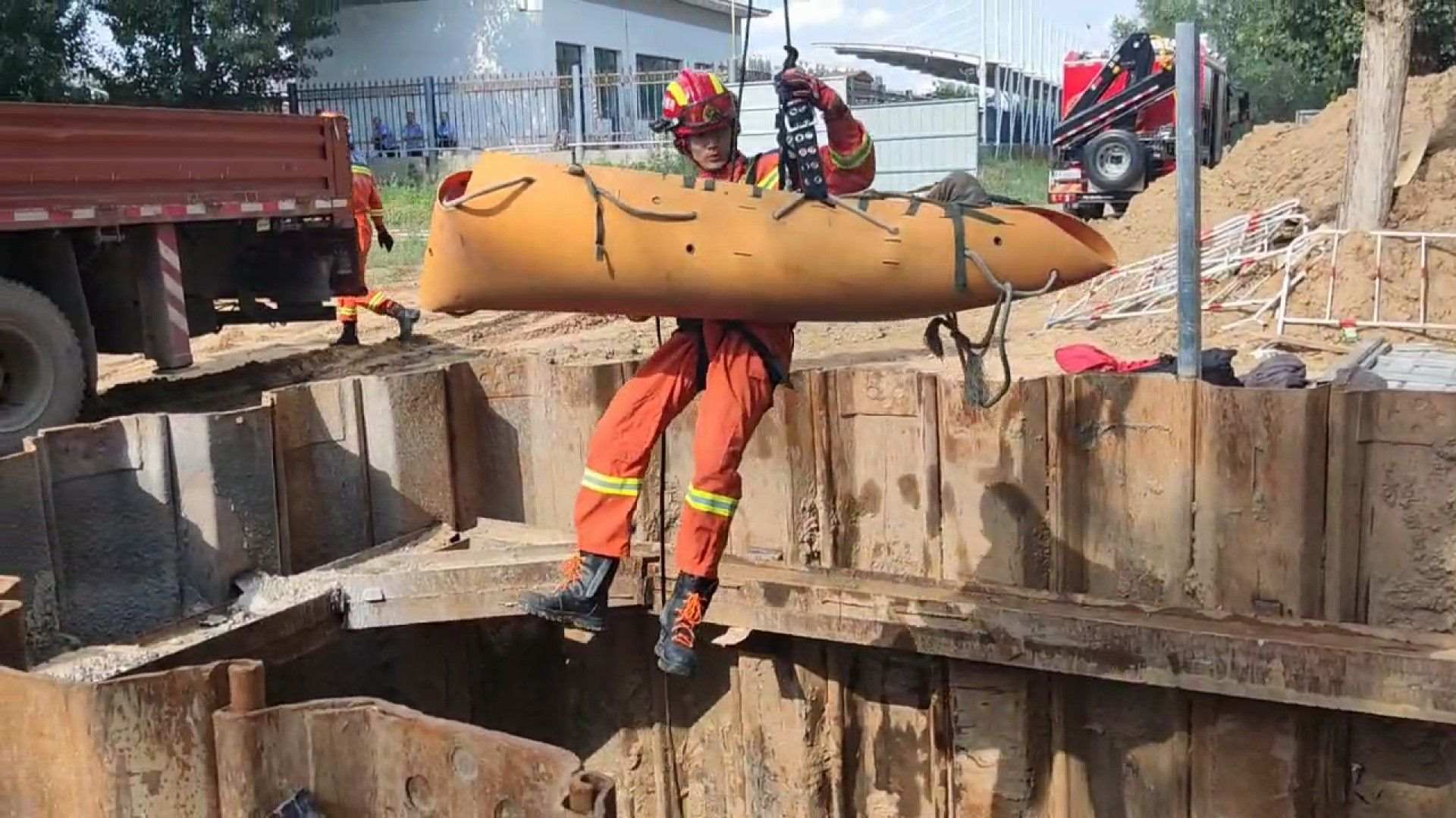 事故發(fā)生后,呼和浩特市消防救援支隊(duì)南二環(huán)路消防救援站趕赴現(xiàn)場處置。救援人員抵達(dá)事發(fā)工地后發(fā)現(xiàn),一名男子躺在一個(gè)深約4米、寬約3米的深坑中。該男子由于左手骨折,肩部受傷無法移動(dòng)。