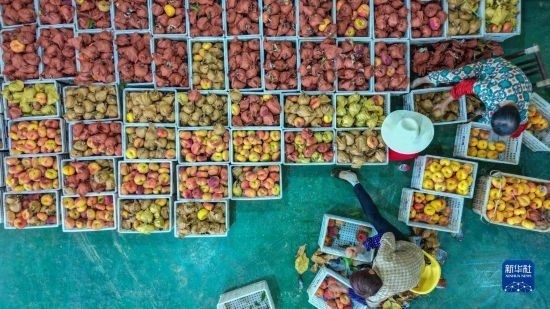 7月7日,在臨湘市聶市鎮(zhèn)乘嶺社區(qū)的涓湖果園,果農(nóng)在分揀蟠桃(無人機(jī)照片)。