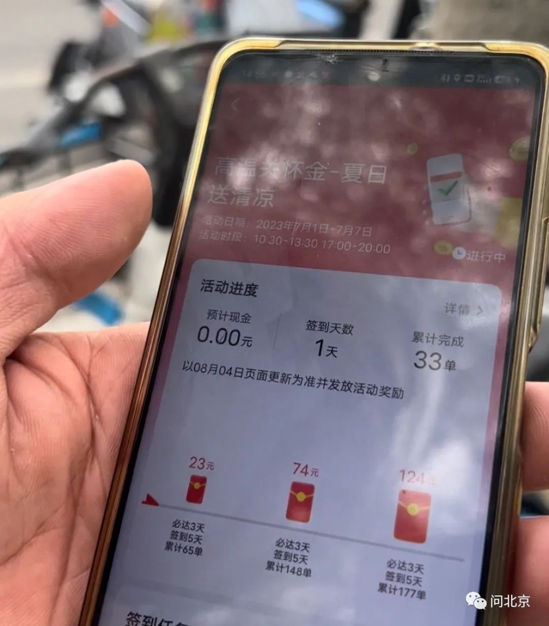 記者點進活動頁面看到,必達3天,簽到5天,累計65單可獎勵23元錢,累計148單可獎勵74元錢,最高獎勵是累積177單可獎勵124元。但是另一名外賣小哥告訴記者,所謂的高溫關(guān)懷金,只是另一種方式的沖單獎勵。
