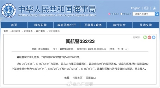 ·航行警告!7月10日0時至7月14日24時,渤海部分海域進行實彈射擊活動,禁止駛?cè)搿?/p>