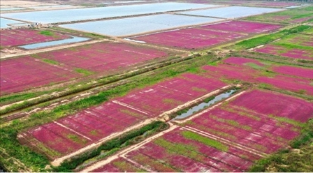 盛夏時節(jié),連云港市灌云縣燕尾港沿海灘涂濕地大片野生鹽蒿漸紅,如一片片紅毯鋪呈大地,美不勝收。