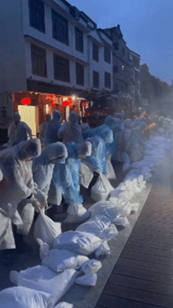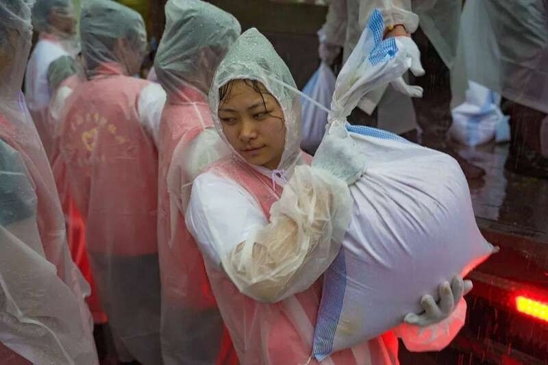 風(fēng)雨中,這群大學(xué)生搬運(yùn)沙袋