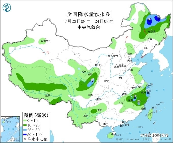 明天,內(nèi)蒙古及東北地區(qū)降雨范圍縮小、強度減弱,黑龍江、吉林西部及甘肅東部、四川北部、浙江、福建北部、江西北部、西藏中部等地有中到大雨,黑龍江中西部部分地區(qū)暴雨(50~70毫米)。