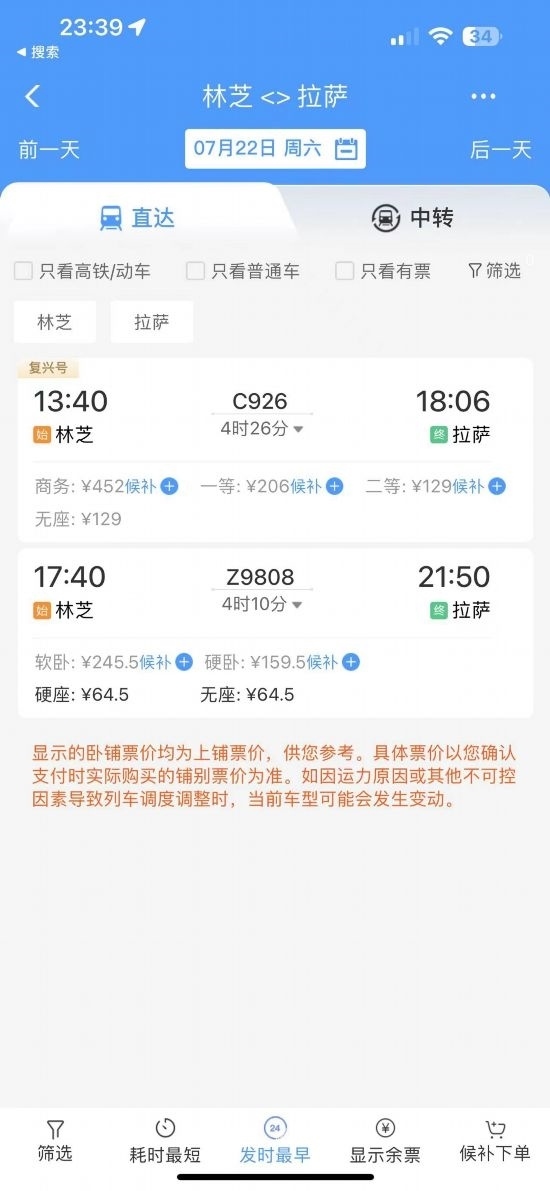 通過在鐵路售票APP上查詢發(fā)現(xiàn),從林芝開往拉薩的復(fù)興號城際列車的二等座票價為129元,直達特快列車硬座為64.5元?!跋啾容^原先180元的客運汽車票價,直達特快列車便宜了近乎三分之一?!辈芟壬锌卣f道。