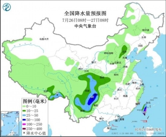 預(yù)計,7月24日08時至25日08時,四川盆地中南部、重慶大部、貴州北部、云南東北部、湖北西南部、湖南西北部以及浙江南部、福建中北部、江西南部、黑龍江北部、西藏東部等地部分地區(qū)有大到暴雨,其中,重慶南部等地局部地區(qū)有大暴雨(100~140毫米)。上述部分地區(qū)伴有短時強降水(最大小時降雨量30~50毫米,局地可超過70毫米),局地有雷暴大風(fēng)等強對流天氣。中央氣象臺7月24日06時繼續(xù)發(fā)布暴雨藍(lán)色預(yù)警。