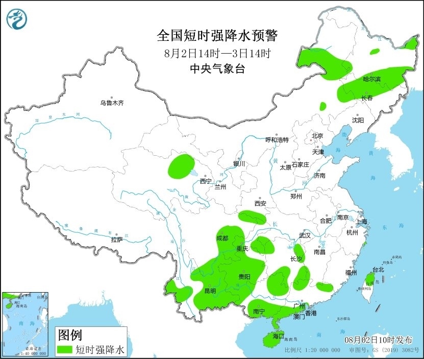 預(yù)計(jì)8月2日14時(shí)至3日14時(shí),內(nèi)蒙古東南部和中部、黑龍江東南部、吉林中西部、遼寧西北部、河北北部、臺(tái)灣島北部等地的部分地區(qū)將有8-10級(jí)雷暴大風(fēng)或冰雹天氣;內(nèi)蒙古東部、黑龍江東部和南部、吉林中西部、青海北部、陜西南部、湖南東部和西部、四川東部和南部、重慶西部和東南部、貴州大部、云南東部和西部、廣西南部和西部、廣東北部和西南部、海南島、臺(tái)灣島北部等地的部分地區(qū)將有短時(shí)強(qiáng)降水天氣,小時(shí)雨量30-50毫米,局地可達(dá)60毫米以上。