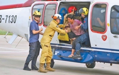 8月4日,黑龍江尚志市一面坡鎮(zhèn)萬(wàn)山村,哈爾濱市森林消防支隊(duì)隊(duì)員正在解救被困村民。新華社發(fā)