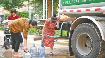8月4日,河北涿州市新星小區(qū),居民從供水車(chē)接水。新華社記者 牟 宇攝