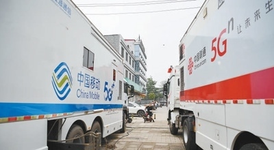 8月3日,應(yīng)急通信車(chē)輛在河北涿州市第三中學(xué)安置點(diǎn)外保障通信。新華社記者 牟 宇攝