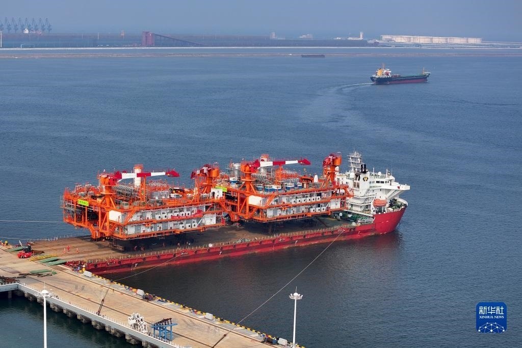 這是8月9日在天津濱海新區(qū)拍攝的渤中19-6凝析氣田I期開發(fā)項目組塊裝船作業(yè)現(xiàn)場。組塊裝船后將赴渤海西部海域,進入海上安裝和聯(lián)調(diào)階段。