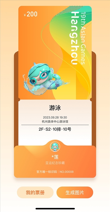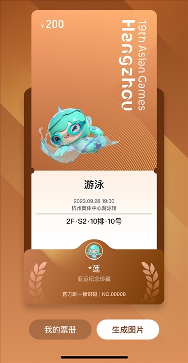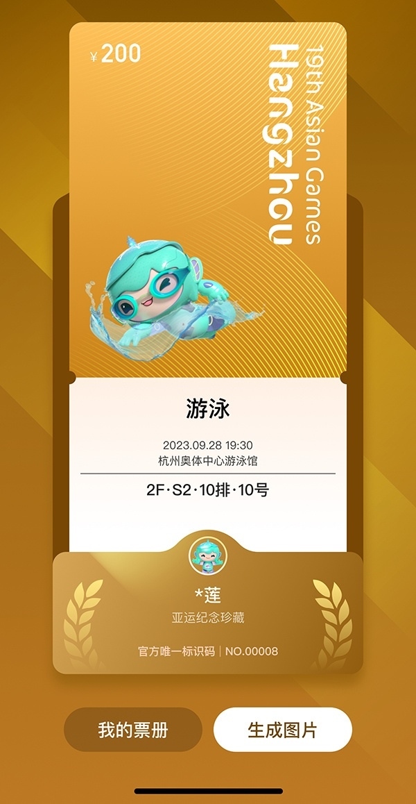 為呼吁全民助力綠色亞運,杭州亞運會推薦使用電子票。凡購買電子票的用戶均可在公眾售票官網(wǎng)H5頁面、智能亞運一站通?票務(wù)通票夾中抽取對應(yīng)項目的電子紀念票,生成專屬票冊,方便收藏、分享、傳播。電子紀念票分金、銀、銅、通用四種類型,抽中比例分別為5%、10%、15%、70%。電子紀念票和專屬電子票冊首次運用于國內(nèi)舉辦的綜合性運動會,是智能辦賽理念的生動體現(xiàn)。