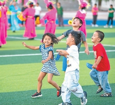 8月9日,小朋友在黑龍江省五常市時代中學集中安置點玩耍。新華社記者 張 濤攝