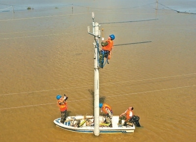 8月9日,國網(wǎng)長春供電公司搶修人員在吉林省榆樹市懷家12組進行作業(yè),為受災群眾恢復生活用電。孟海鷹 張 鵬攝影報道