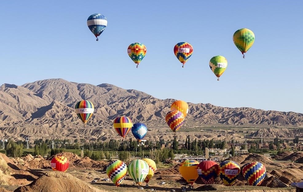來(lái)自全國(guó)各地的熱氣球運(yùn)動(dòng)員駕乘熱氣球,在甘肅張掖七彩丹霞上空進(jìn)行飛行表演,上演熱氣球與丹霞的美麗邂逅。