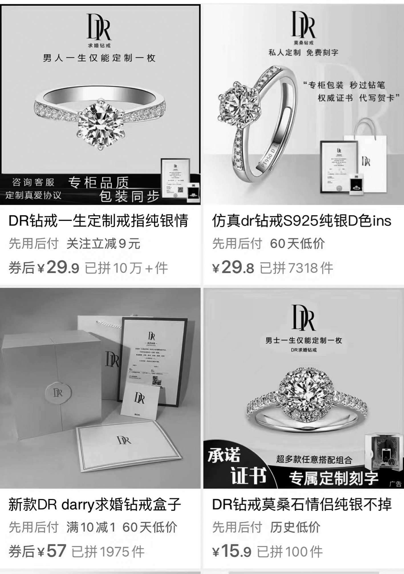 記者在一家電商平臺(tái)輸入“DR鉆戒”,映入眼簾的商品售價(jià)只要幾十塊,幾乎都把“男士一生僅能定制一枚”作為賣點(diǎn)。還有商家寫道,“專柜品質(zhì)、包裝同步”“咨詢客服定制真愛協(xié)議”。