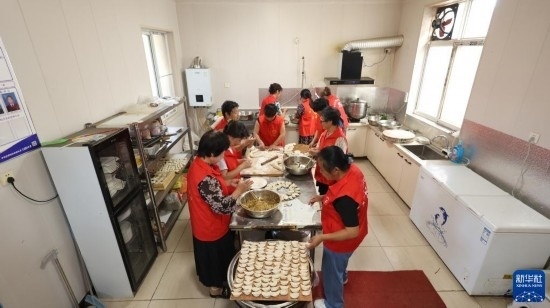 8月22日,青縣金牛鎮(zhèn)大鵓鴿留村孝老食堂的志愿者準備餐食。