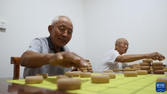 8月22日,老人在青縣曹寺鎮(zhèn)曹寺村的孝老食堂與志愿者下象棋。