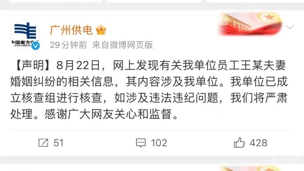 8月22日晚間,廣州供電局官方社交賬號(hào)發(fā)布聲明稱:“8月22日,網(wǎng)上發(fā)現(xiàn)有關(guān)我單位員工王某夫妻婚姻糾紛的相關(guān)信息,其內(nèi)容涉及我單位。我單位已成立核查組進(jìn)行核查,如涉及違法違紀(jì)問題,我們將嚴(yán)肅處理。感謝廣大網(wǎng)友關(guān)心和監(jiān)督。”