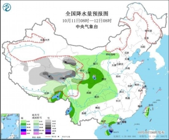 10月11日08時至12日08時,甘肅西部、新疆南部、西藏北部和東部、青海大部、四川西北部等地部分地區(qū)有小到中雪或雨夾雪,其中,青海北部和南部局地有大雪或暴雪。西藏東南部、甘肅東部、陜西西南部、四川北部、云南西北部、雷州半島、海南島大部、臺灣東部等地部分地區(qū)有中到大雨,其中海南島東北部等地局地有暴雨(50~90毫米)。內(nèi)蒙古中部、河北西北部、山東半島、浙江、廣西南部等地部分地區(qū)有4~5級風(fēng)。東海南部、臺灣海峽、南海北部海域?qū)⒂?~7級、陣風(fēng)8~9級風(fēng)。