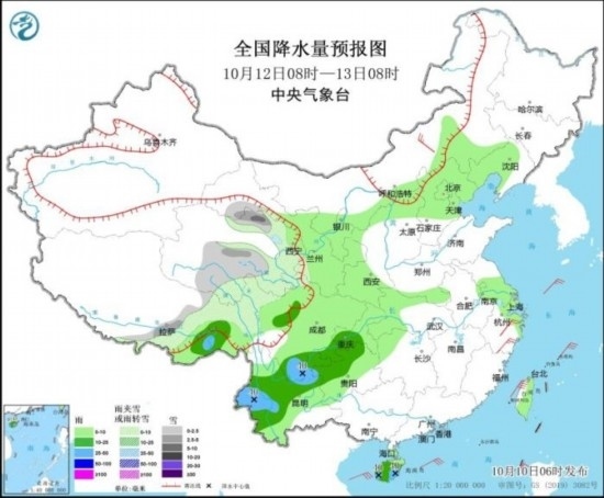 10月12日08時至13日08時,甘肅西部、青海大部、西藏東部、四川西北部等地部分地區(qū)有小到中雪或雨夾雪,局地有大雪。西藏東南部、四川南部、重慶西部、貴州西北部、云南中西部和北部、海南島大部等地部分地區(qū)有中到大雨。內(nèi)蒙古中部、浙江等地部分地區(qū)有4~5級風(fēng)。東海大部、臺灣海峽、南海北部海域?qū)⒂?~7級、陣風(fēng)8~9級風(fēng)。