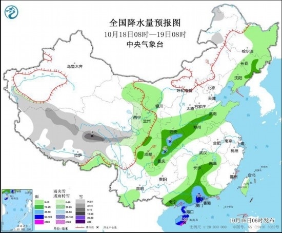 10月17日08時(shí)至18日08時(shí),新疆西南部山區(qū)、西藏、青海東部和南部、甘肅西部、川西高原北部等地的部分地區(qū)有小到中雪或雨夾雪,其中青海南部等地局地大雪;甘肅南部、陜西、山西中北部、四川北部、廣東中西部、海南島等地的部分地區(qū)有中到大雨,其中,海南島東部、廣東中部偏南地區(qū)局地有暴雨(50~90毫米)。內(nèi)蒙古中東部、廣西東南部、海南島等地的部分地區(qū)有4~6級風(fēng)。
