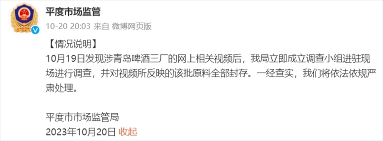 《每日經(jīng)濟(jì)新聞》記者注意到,青島啤酒三廠所在地的平度市市場監(jiān)管局也發(fā)布情況說明稱,10月19日發(fā)現(xiàn)涉青島啤酒三廠的網(wǎng)上相關(guān)視頻后,我局立即成立調(diào)查小組進(jìn)駐現(xiàn)場進(jìn)行調(diào)查,并對視頻所反映的該批原料全部封存?!耙唤?jīng)查實(shí),我們將依法依規(guī)嚴(yán)肅處理。”