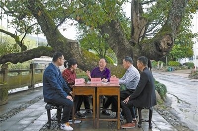 圖①:巡回審判。圖為諸暨法院法官在東溪村百年古樟樹下開展巡回審判,依法對(duì)兩起非法狩獵的刑事案件進(jìn)行公開審理并當(dāng)庭宣判。