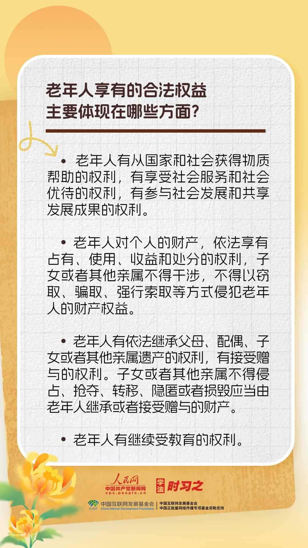 《中華人民共和國老年人權(quán)益保障法》的出臺進一步保障了老年人的合法權(quán)益,弘揚了中華民族敬老、養(yǎng)老、助老的美德。重陽節(jié),一起來了解老年人權(quán)益保障法的相關(guān)規(guī)定。