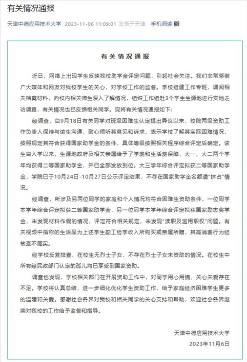 ·天津中德應(yīng)用技術(shù)大學(xué)通報(bào)助學(xué)金事件調(diào)查結(jié)果:不存在國(guó)家助學(xué)金名額遭“擠占”情況。