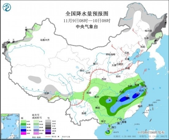 圖3 全國降水量預(yù)報(bào)圖(11月9日08時(shí)-10日08時(shí)) 圖片來源:中央氣象臺(tái)網(wǎng)站