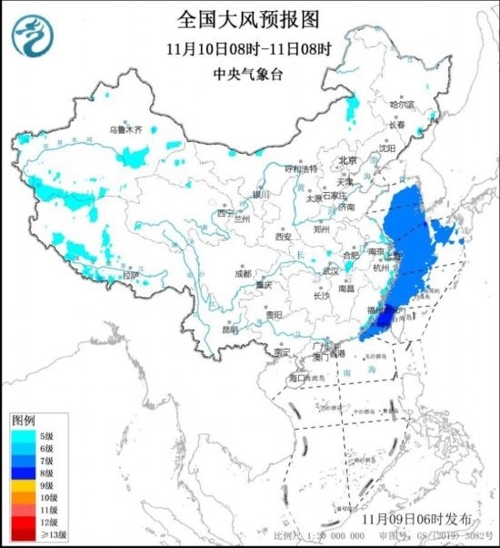 11月10日08時(shí)至11日08時(shí),黃海中部和南部海域、東海大部海域、臺(tái)灣海峽、南海東北部偏北海域?qū)⒂?~8級(jí)、陣風(fēng)9~10級(jí)的大風(fēng)。新疆東部和南部、西藏南部和西北部、內(nèi)蒙古東部、東南沿海將有5~6級(jí)、陣風(fēng)7~8級(jí)的大風(fēng)。中央氣象臺(tái)11月9日06時(shí)發(fā)布大風(fēng)藍(lán)色預(yù)警(見圖1、2)。