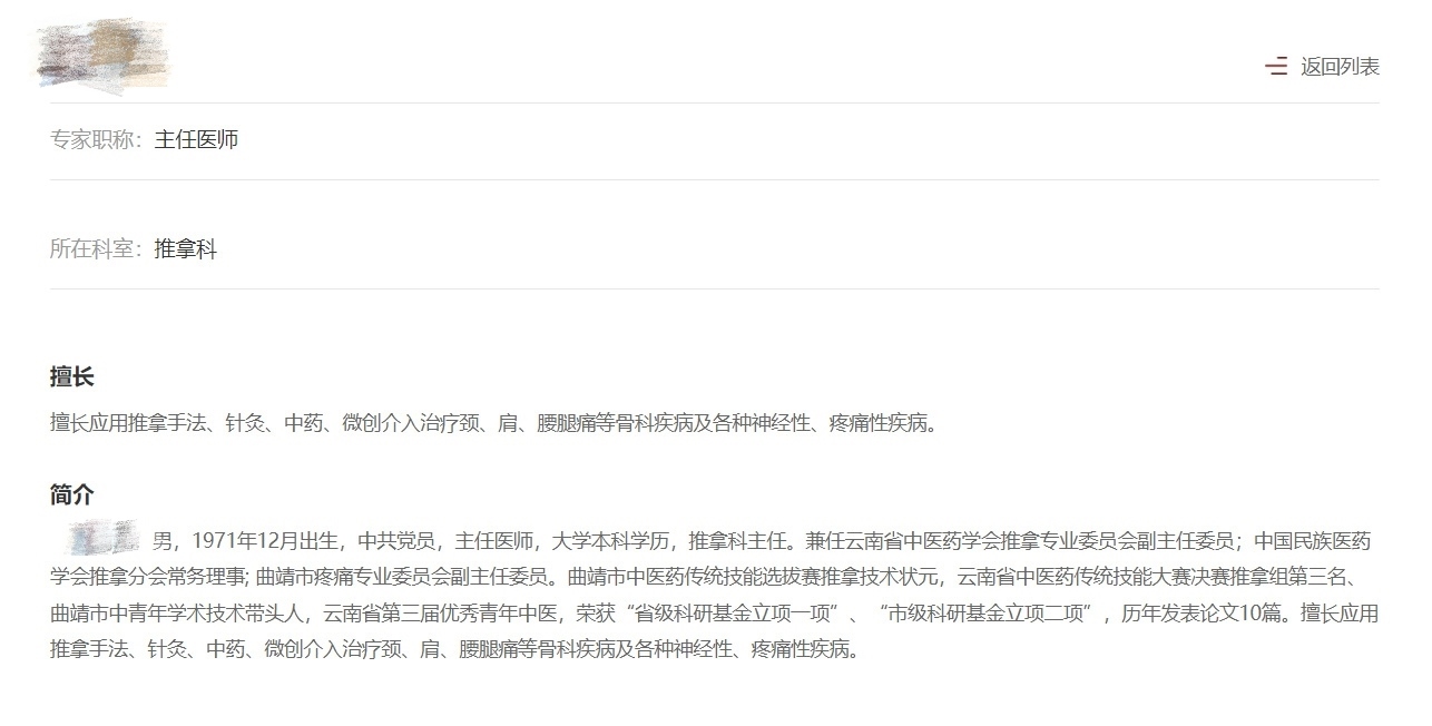 而在曲靖中醫(yī)醫(yī)院官網(wǎng)上,張樹昆醫(yī)生的簡介為:推拿科主任醫(yī)師,擅長應用推拿手法、針灸、中藥、微創(chuàng)介入治療肩、頸、腰腿等骨科疾病及各種神經(jīng)性、疼痛性疾病。