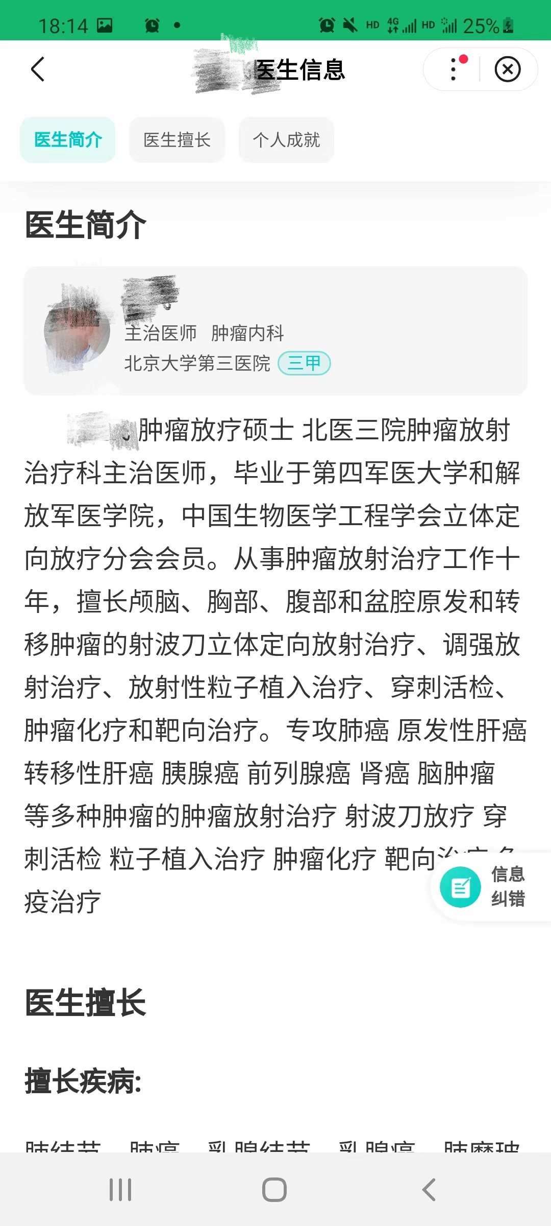 吳先生發(fā)給記者的百度健康頁面上顯示:這位醫(yī)生是腫瘤內科的主治醫(yī)師,但其個人介紹里又寫著他是腫瘤放療科主治醫(yī)師,放療科醫(yī)生的執(zhí)業(yè)證書和內科不同,吳先生也對平臺提出過質疑,醫(yī)生到底是哪個科的?是否專業(yè)?