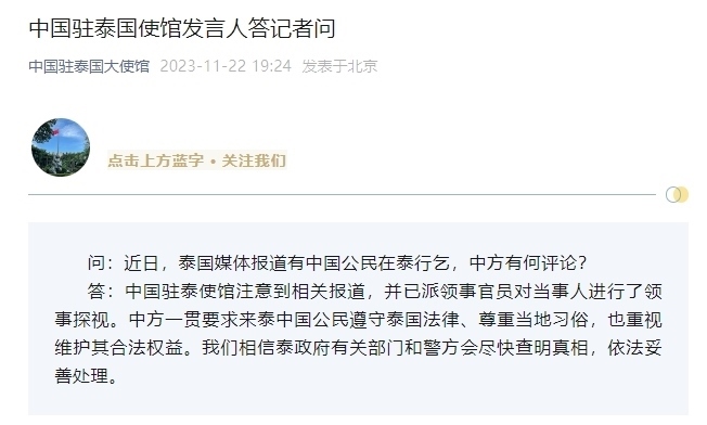 ·中國駐泰國大使館回應(yīng)網(wǎng)傳有中國公民在泰行乞:注意到相關(guān)報道,并已派領(lǐng)事官員對當(dāng)事人進(jìn)行了領(lǐng)事探視。