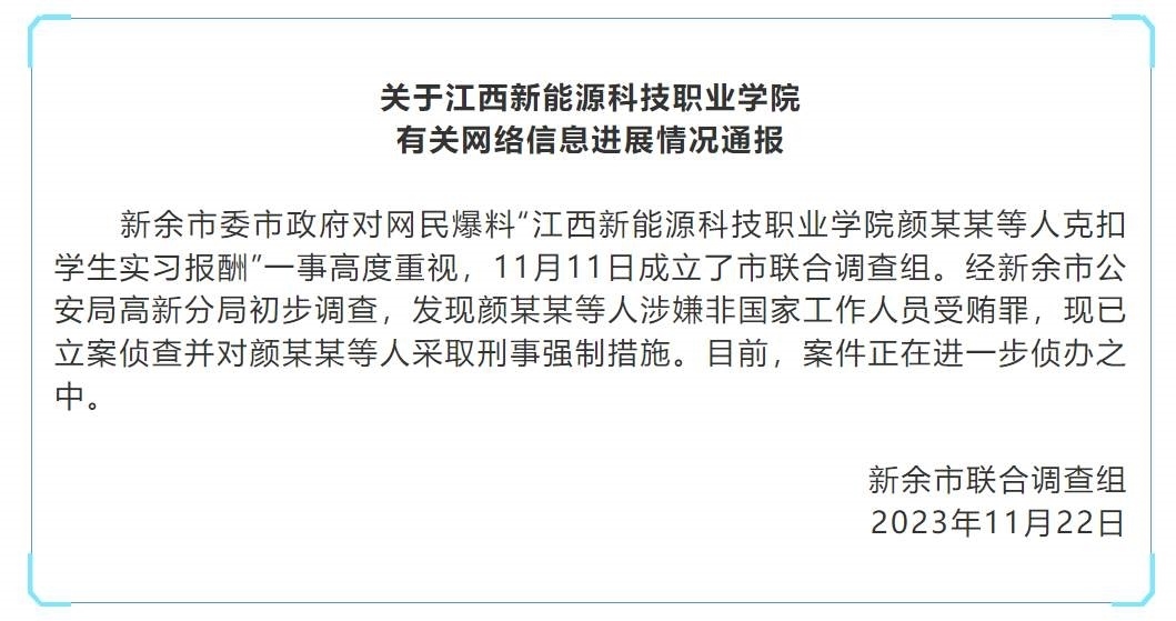 ·江西新余通報一職校被舉報克扣學(xué)生實(shí)習(xí)報酬:多人涉嫌受賄被控制。