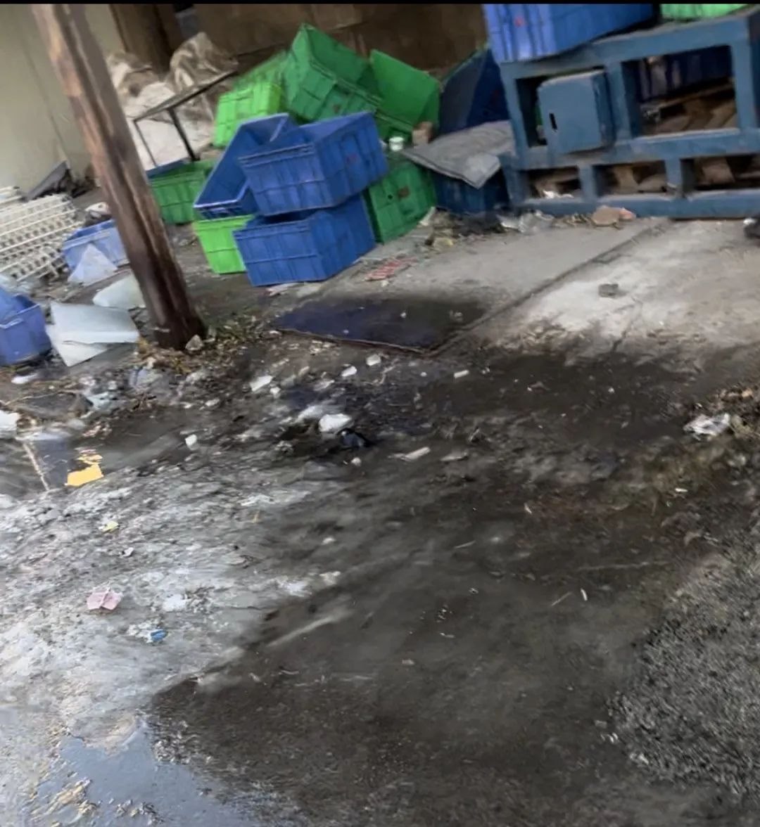 進入廠房首先看到的就是一整車餐余垃圾,靠墻放置著多箱已使用后的餐具,地面上存有積水,機器處于停止狀態(tài),工作臺上留有殘余垃圾,還有鞋墊在上面晾曬。在此期間有多輛小型貨車來裝卸餐具。