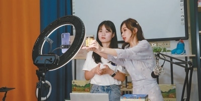 沈珺(右)在指導(dǎo)學(xué)生進(jìn)行直播營銷。汪玉瑩攝
