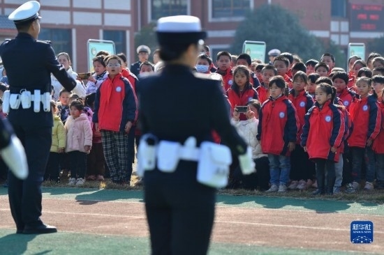 12月1日,在長沙市望城區(qū)新河學校,學生觀看交警手勢演示。