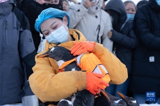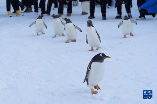 時(shí)值周末,哈爾濱極地公園的企鵝亮相戶外,上演冰雪巡游,吸引許多游客前來觀賞。目前正是黑龍江省哈爾濱市的冰雪旅游季。