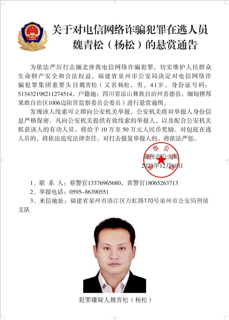 為依法嚴厲打擊緬北涉我電信網(wǎng)絡(luò)詐騙犯罪,切實維護人民群眾生命財產(chǎn)安全和合法權(quán)益,遼寧省大連市公安局決定對白所成、白應(yīng)蒼(又名李云晨)、白應(yīng)蘭(又名李夢娜)進行公開懸賞通緝;福建省泉州市公安局決定對魏懷仁、魏榕(又名陳榕)、魏青松(又名楊松)進行公開懸賞通緝;福建省龍巖市公安局決定對劉正祥、劉積光(又名李華光)、劉正茂進行公開懸賞通緝;重慶市公安局決定對徐老發(fā)(又名徐發(fā)啟)進行公開懸賞通緝。