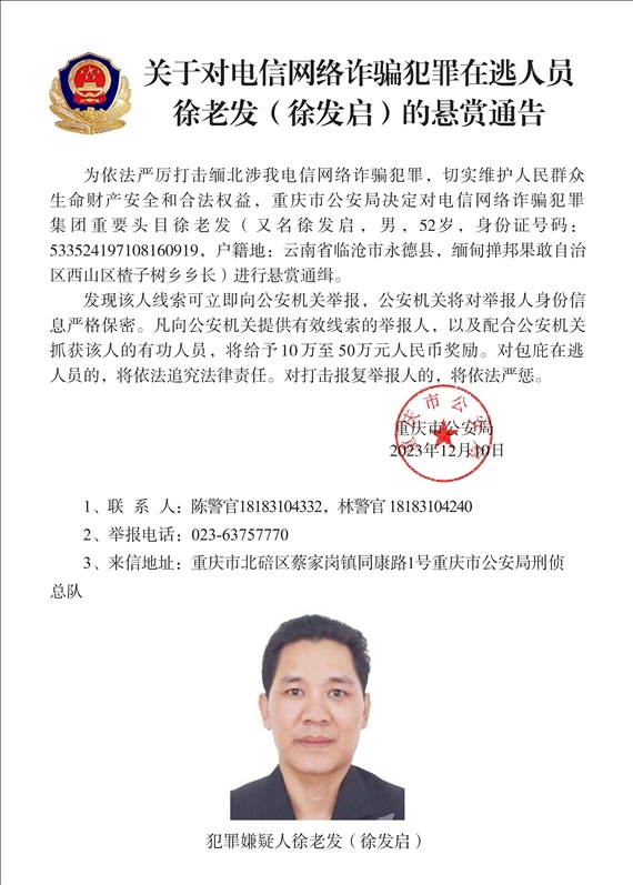 人民網(wǎng)北京12月10日電 (高清揚、梁秋坪)據(jù)公安部消息,針對當前緬北涉我電信網(wǎng)絡(luò)詐騙犯罪嚴峻形勢,我公安機關(guān)先后對多名電信網(wǎng)絡(luò)詐騙犯罪集團重要頭目進行公開通緝,形成強大震懾。近日,在掌握相關(guān)犯罪事實和證據(jù)的基礎(chǔ)上,遼寧、福建、重慶等地公安機關(guān)決定對白所成、魏懷仁、劉正祥等10名緬北果敢自治區(qū)電信網(wǎng)絡(luò)詐騙犯罪集團重要頭目進行公開懸賞通緝,堅決打掉犯罪分子囂張氣焰。