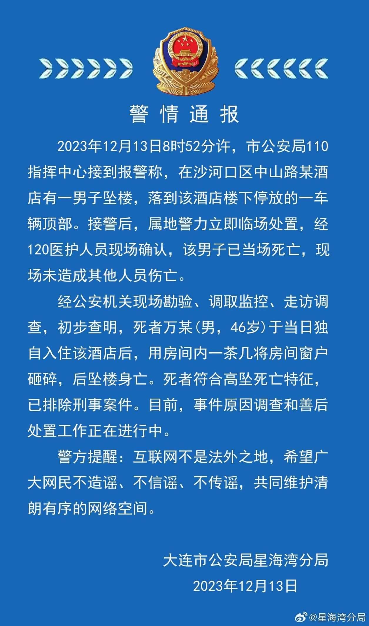 ·警方通報大連一酒店男子墜樓身亡:46歲男子用茶幾砸碎窗戶,排除刑案、