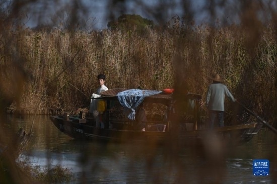 12月14日,游客乘坐搖櫓船在西溪濕地欣賞蘆花。
