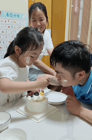 一家三口在還未裝修完的房子里奔跑嬉戲