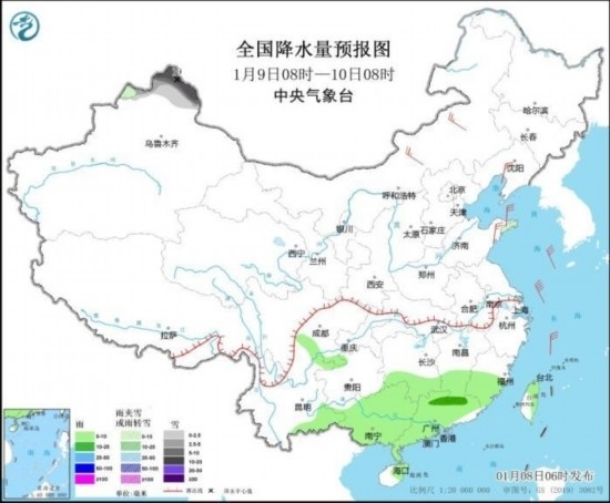 全國(guó)降水量預(yù)報(bào)圖(1月9日08時(shí)-10日08時(shí)) 來源:中央氣象臺(tái)網(wǎng)站