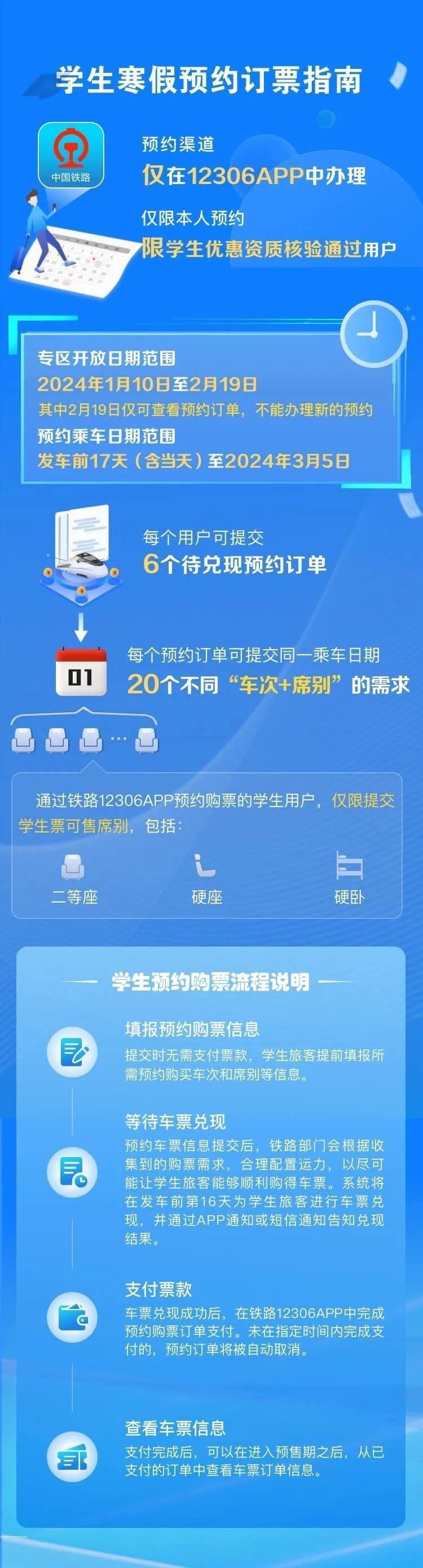 為認真貫徹落實黨中央國務(wù)院關(guān)于做好2024年元旦春節(jié)期間有關(guān)工作的要求,保障學(xué)生、務(wù)工人員等重點群體春運出行,鐵路12306創(chuàng)新服務(wù)舉措,為學(xué)生、務(wù)工人員推出了售票服務(wù)專區(qū)。自1月10日起,符合條件的學(xué)生旅客(已通過學(xué)生優(yōu)惠資質(zhì)核驗且有剩余優(yōu)惠乘車次數(shù))可通過“學(xué)生寒假訂票專項服務(wù)”專區(qū)預(yù)約購買春運期間(1月26日至3月5日)火車票,每名旅客最多可同時提交6個預(yù)約訂單,每個訂單可添加1個乘車日期的20個“車次+席別”的組合,可選席別為學(xué)生優(yōu)惠票適用的硬座、硬臥、二等座。已通過實名制核驗的務(wù)工人員可通過“務(wù)工人員春運預(yù)約訂票服務(wù)”專區(qū)預(yù)約購買春運期間火車票,每名旅客可同時提交6個預(yù)約訂單,每個訂單可選擇“時間+車次+席別”的1個組合。