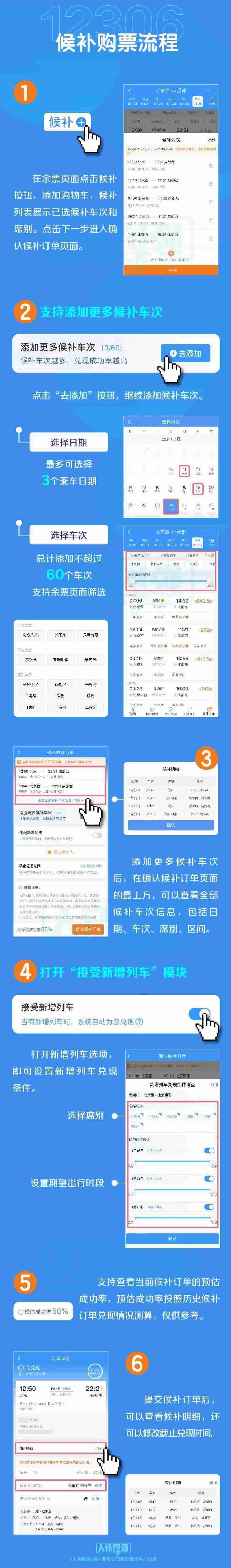 為提升旅客購票體驗(yàn),鐵路部門加大研發(fā)力度,對(duì)鐵路12306候補(bǔ)購票功能進(jìn)行了優(yōu)化升級(jí)。一是增加候補(bǔ)訂單數(shù)量。每名旅客可提交的待兌現(xiàn)候補(bǔ)訂單數(shù)量由2個(gè)增至6個(gè),每個(gè)訂單最多可添加9名乘車人。二是增加備選方案數(shù)量。原來旅客提交候補(bǔ)訂單時(shí),可選擇相鄰2個(gè)乘車日期、每個(gè)日期可選擇5個(gè)“車次+席別”的組合,最多可選擇10個(gè)組合。優(yōu)化升級(jí)后,旅客可選擇預(yù)售期內(nèi)任意3個(gè)乘車日期,累計(jì)最多可選擇60個(gè)“日期+車次”的組合,每個(gè)車次可選多個(gè)席別。三是擴(kuò)大候補(bǔ)訂單兌現(xiàn)時(shí)間選擇范圍。原來候補(bǔ)訂單截止兌現(xiàn)時(shí)間最晚為開車前2小時(shí),優(yōu)化升級(jí)后調(diào)整為開車前20分鐘,旅客可在更大范圍內(nèi)根據(jù)實(shí)際情況自主選擇修改截止兌現(xiàn)時(shí)間。四是臨時(shí)新增旅客列車席位優(yōu)先配售給已提交候補(bǔ)訂單的旅客。旅客在提交候補(bǔ)訂單時(shí),可選擇接受購買符合出行需求的新增旅客列車車票,如鐵路部門臨時(shí)新增旅客列車,在車票起售時(shí),鐵路12306將自動(dòng)優(yōu)先配售給已提交候補(bǔ)訂單的旅客,旅客無需人工查詢?cè)鲩_列車信息再購票。