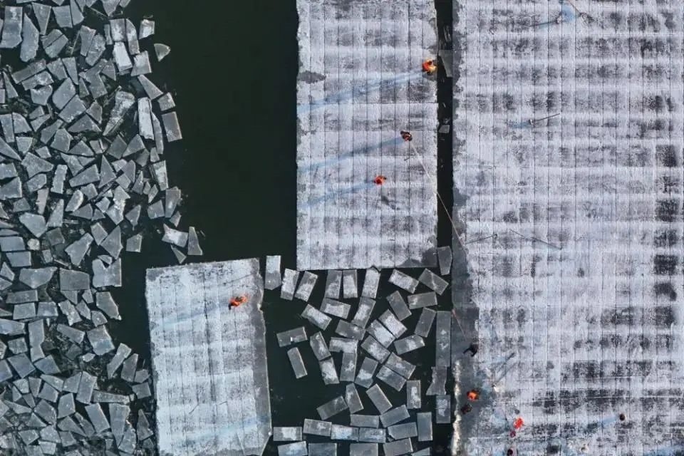 工人在松花江上的采冰現(xiàn)場(chǎng)進(jìn)行采冰作業(yè)。圖源:新華社