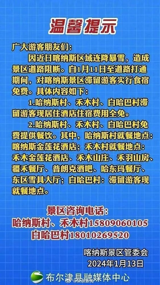1月13日,喀納斯景區(qū)發(fā)布公告稱,對滯留游客實行食宿免費 來源網(wǎng)絡(luò)